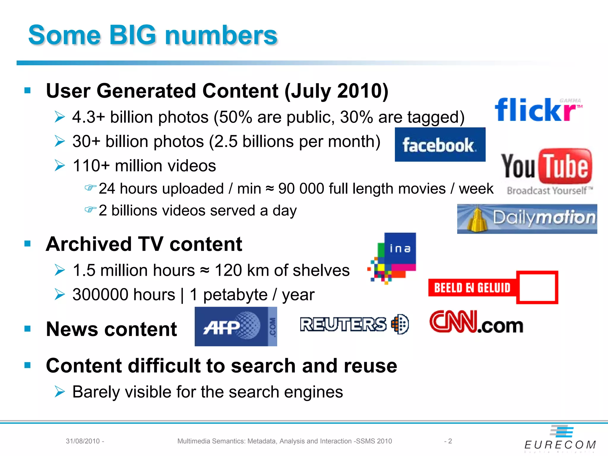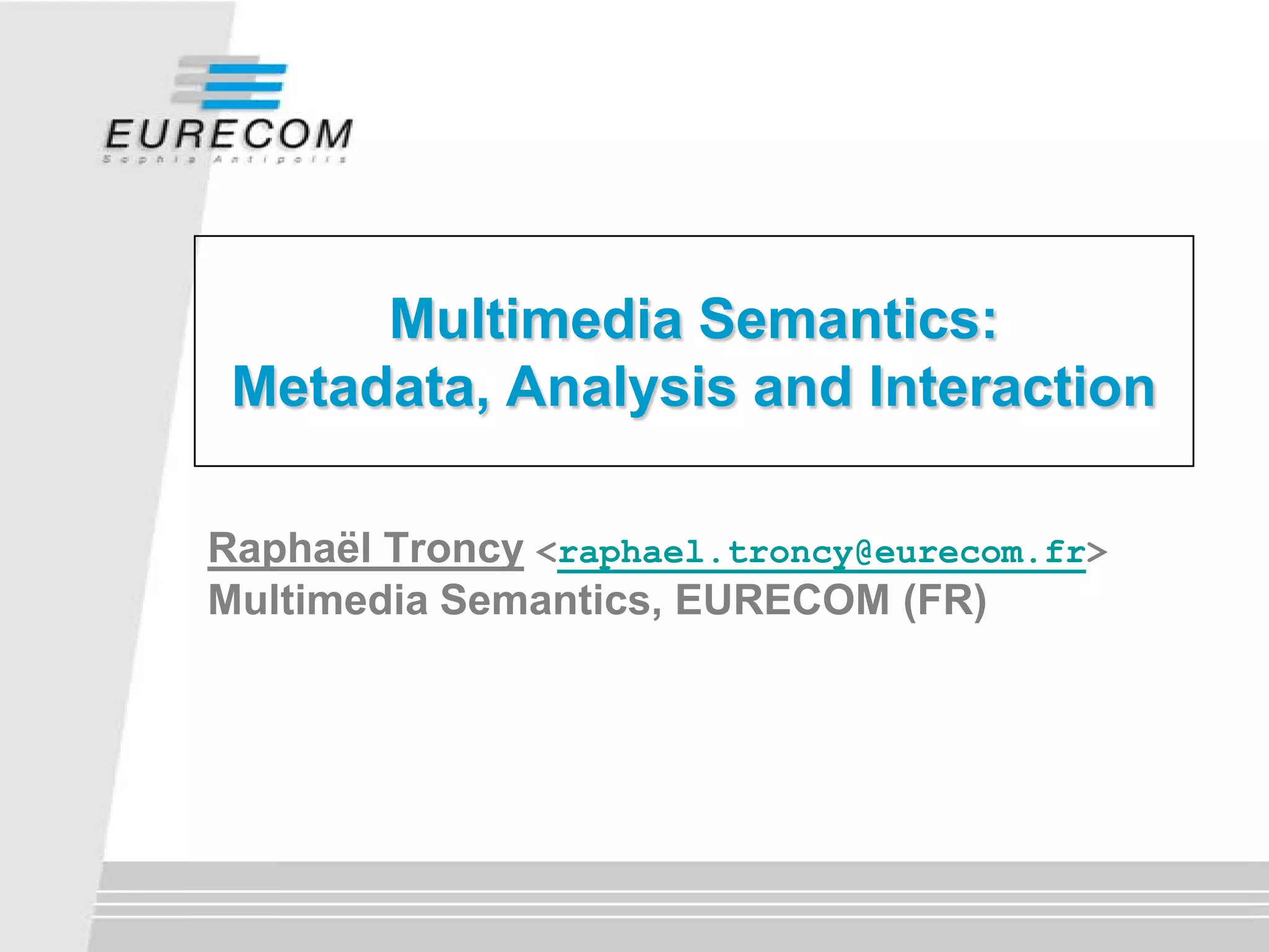 The document discusses multimedia semantics, focusing on challenges in metadata, analysis, and interaction of user-generated content, including large quantities of multimedia data like photos and videos. It highlights issues in multimedia indexing and retrieval due to the semantic gap between what machines can interpret and user expectations. The document emphasizes the importance of annotations, concepts in multimedia, and the role of ontologies in improving multimedia accessibility and search functionalities.