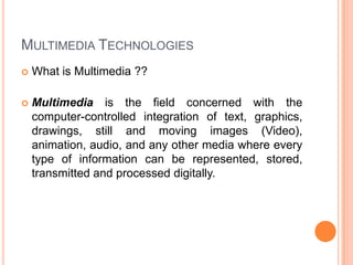 The document provides an overview of multimedia technologies, defining multimedia as the integration of various forms of information such as text, audio, graphics, animation, and video. It discusses the evolution from text-based interfaces in early PCs to complex multimedia applications, highlighting concepts like interactivity, hypertext, and hypermedia. Various components, applications, and software tools for creating and managing multimedia content are also outlined, illustrating the breadth and functionality of multimedia systems today.