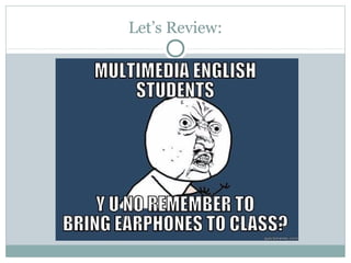 The document provides instructions for students to review past material, watch music videos discussing various rock bands and their histories, explore Easter eggs on YouTube by typing certain phrases into the search bar, and prepare a group presentation on a meme for next Tuesday where classmates will grade the presentation. Students are given options for memes to choose from and websites to create their meme. An upcoming Kahoot game is also announced.