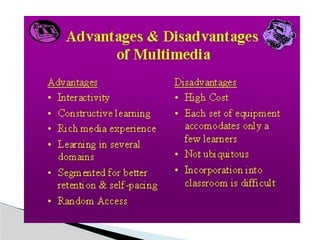 Multimedia is defined as a combination of text, graphics, sound, animation, and video delivered interactively through electronic means. It can be classified into linear and non-linear categories, with applications across various fields such as business, education, entertainment, and public spaces. The document emphasizes the significance of multimedia in enhancing communication and engagement by utilizing multiple senses.