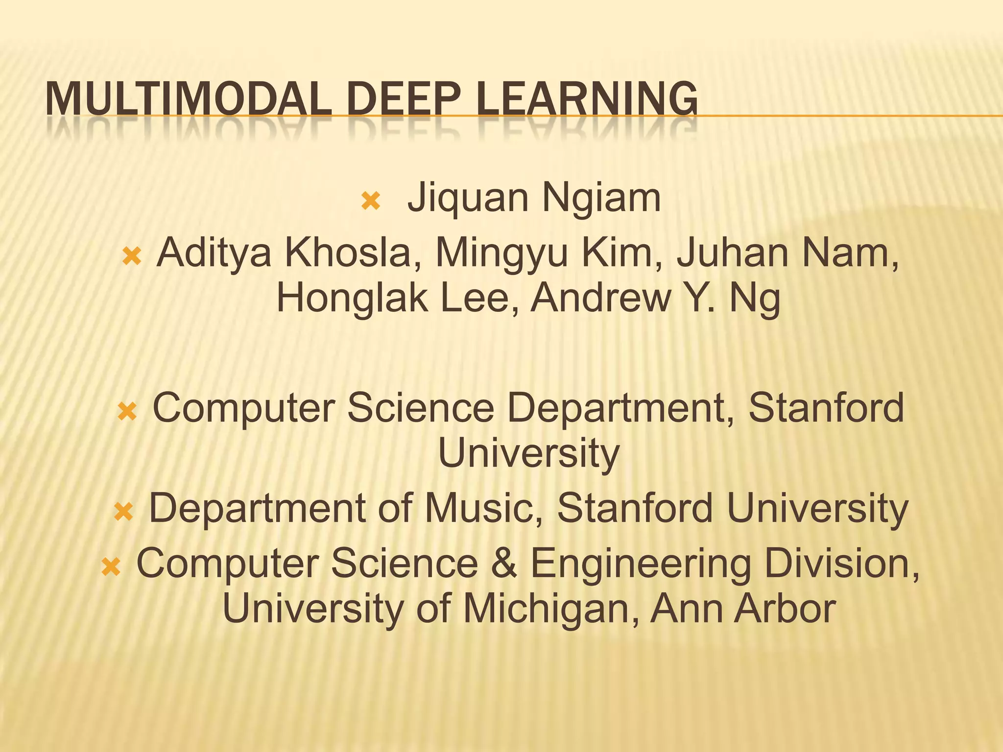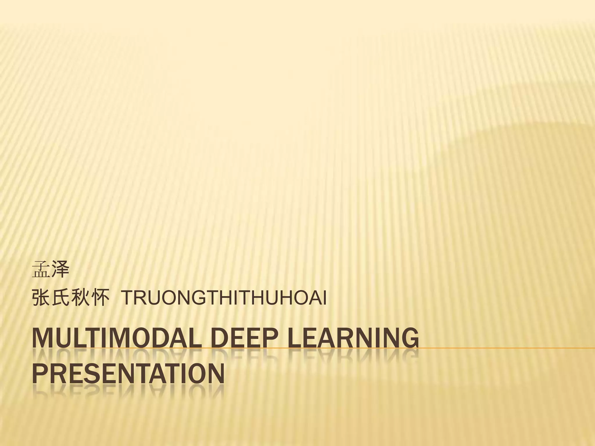 This presentation discusses multimodal deep learning and unsupervised feature learning from audio and video speech data. It introduces the McGurk effect where audio-visual speech is integrated. An autoencoder model is used to learn shared representations from audio and video input that outperform single modality learning on lip-reading tasks. On the AVLetters dataset, the cross-modality features achieved a classification accuracy of 64.4%, and on the CUAVE dataset, an accuracy of 68.7%.