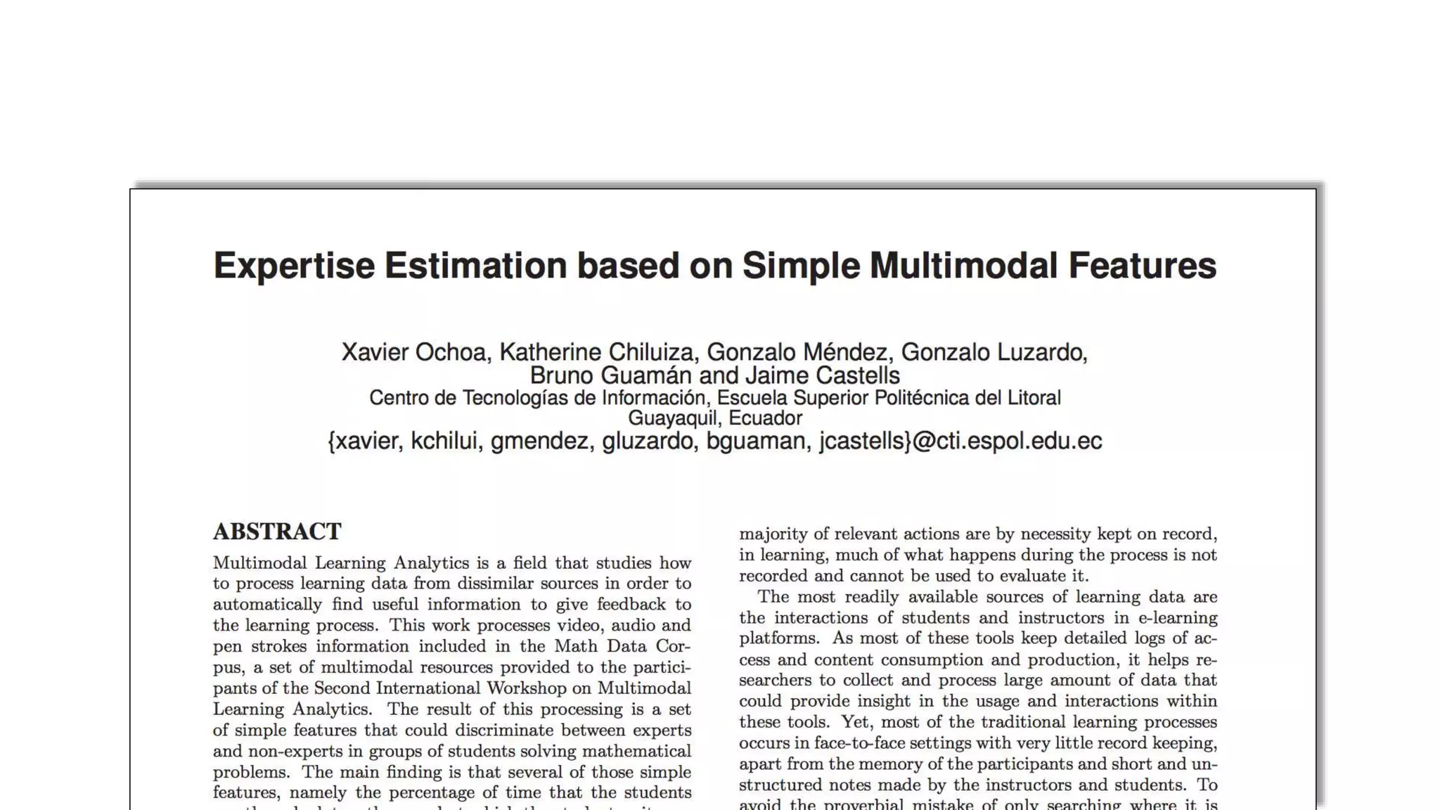 This document discusses multimodal learning analytics (MLA), which examines learning through multiple modalities like video, audio, digital pens, etc. It provides examples of extracting features from these modalities to analyze problem solving, expertise levels, and presentation quality. Key challenges of MLA are integrating different modalities and developing tools to capture real-world learning outside online systems. While current accuracy is limited, MLA is an emerging field that could provide insights beyond traditional learning analytics.