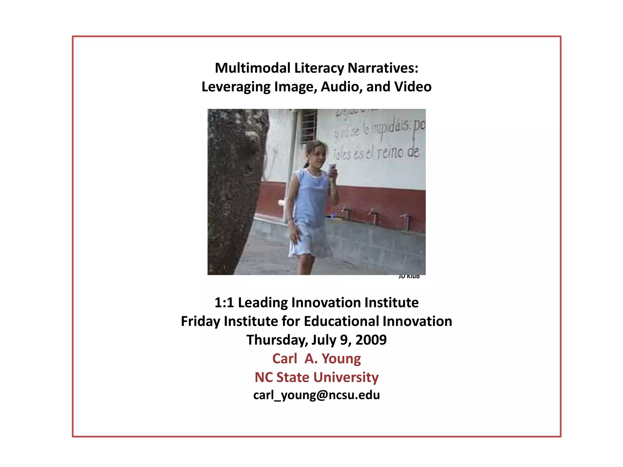 The document discusses the integration of digital video (DV) into English Language Arts (ELA) education, emphasizing its role in promoting multimodal literacy. It presents various frameworks and pedagogical approaches, such as TPACK and new literacies, to enhance teaching and learning experiences through DV. Additionally, it provides examples of activities that leverage DV for narrative composition and encourages educators to explore innovative practices in the classroom.