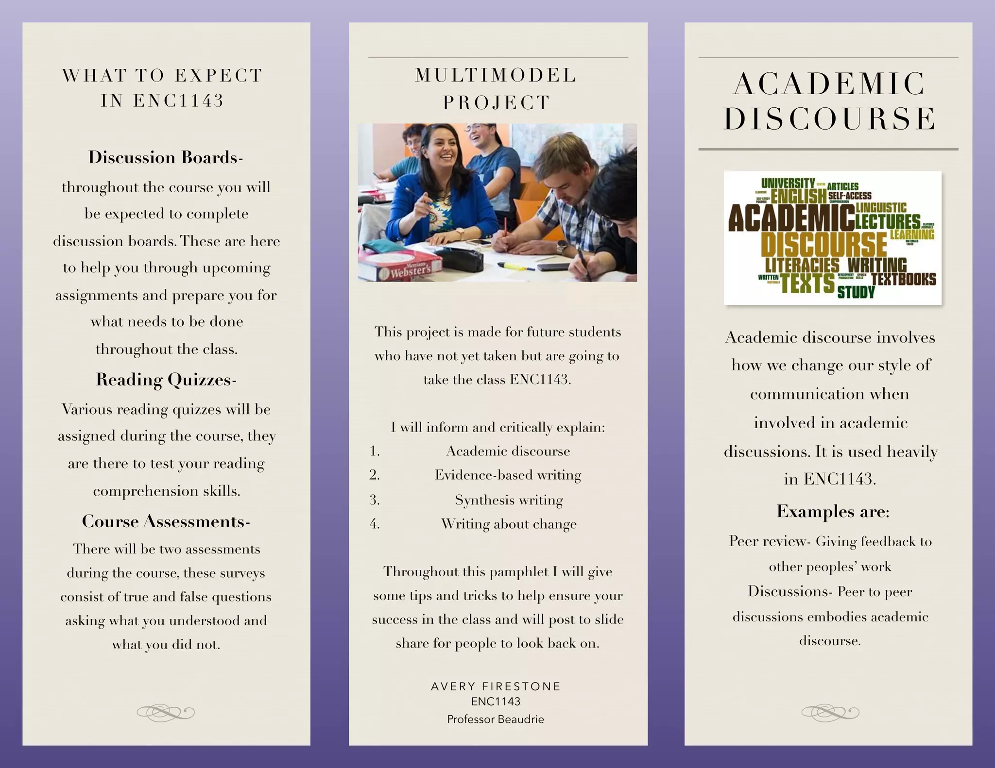 This document outlines essential components of the ENC1143 course, including expectations for discussion boards, reading quizzes, and assessments to enhance academic discourse. It provides guidance on effective time management, writing practices such as evidence-based and synthesis writing, and emphasizes the importance of citing sources to avoid plagiarism. Additionally, it shares personal experiences and tips for succeeding in writing assignments, particularly in writing about change.