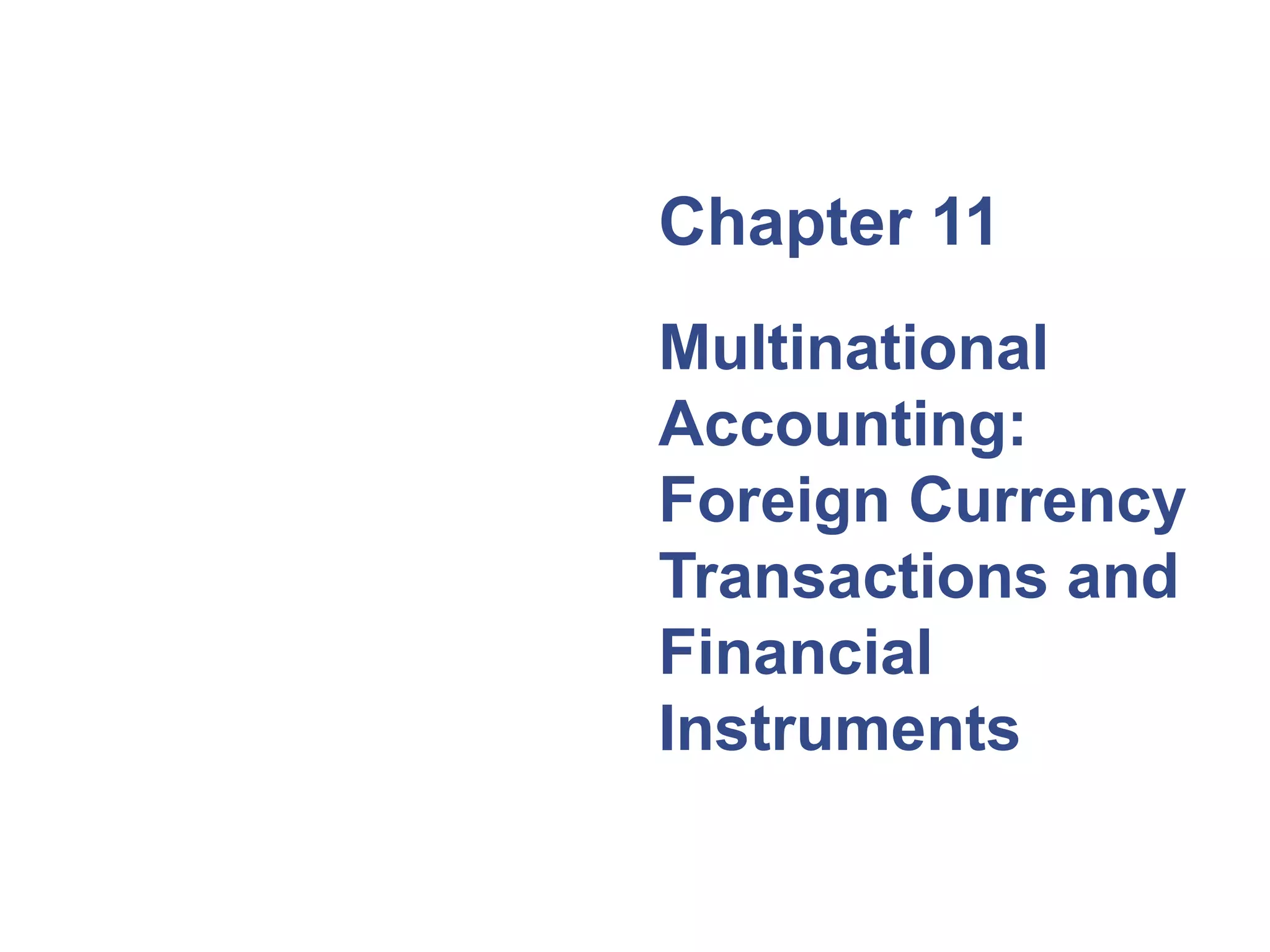 This chapter discusses accounting issues related to foreign currency transactions and financial instruments for multinational companies. It covers how to record and report transactions involving foreign currencies, the different types of exchange rates used to translate balances, and how to account for imports/exports and hedging strategies using financial instruments. The key aspects are translating foreign currency transactions and balances to the reporting currency, managing foreign currency risk, and designating hedges as either fair value, cash flow, or net investment hedges for accounting purposes.