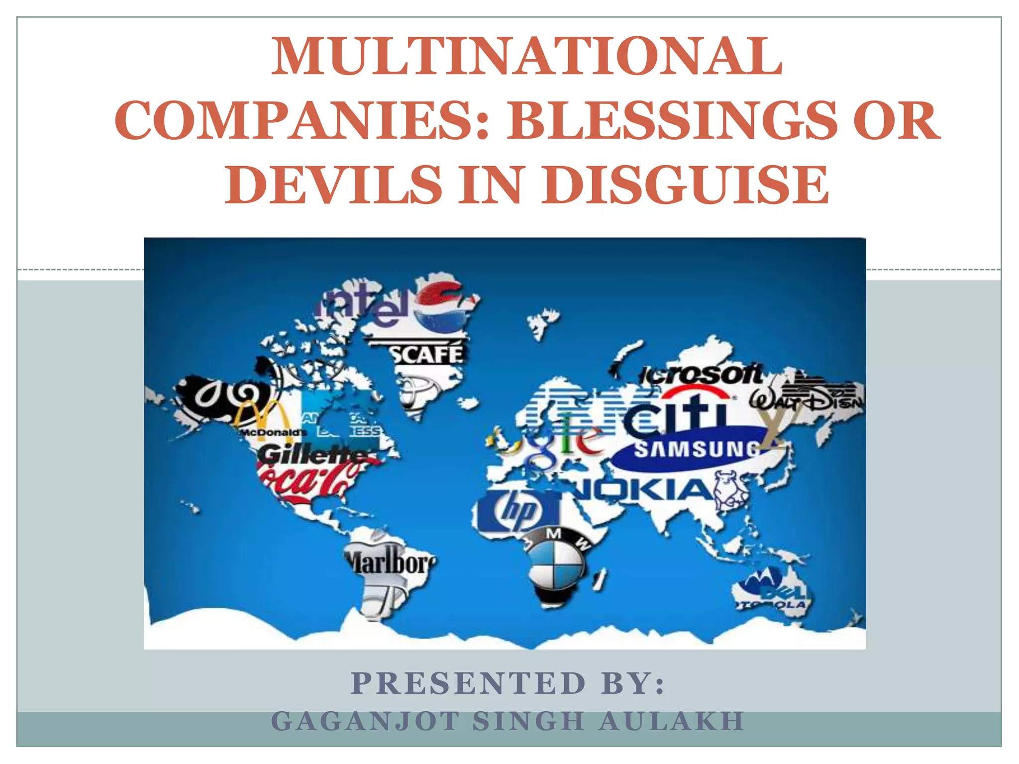 This document discusses multinational corporations (MNCs), their impact on developing countries like India, and whether they are a blessing or curse. It notes that while MNCs provide benefits like jobs and technology, they can also exploit resources and cultures. MNCs face challenges operating in foreign markets due to differences in policies, cultures and risks. Overall, the document suggests that MNCs can benefit developing nations if regulated properly to balance economic opportunities with social and environmental protections.