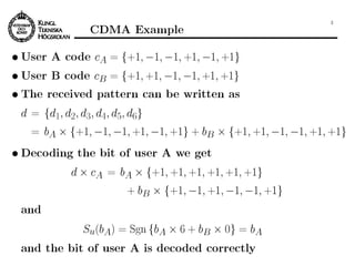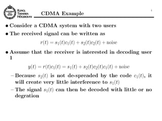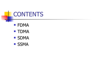 The document discusses multiple access techniques for wireless communications, focusing on methods such as FDMA, TDMA, CDMA, and SDMA, explaining their operational principles and equipment requirements. It highlights the trade-offs, efficiencies, and practical applications of each technique, including their impacts on user capacity and signal quality. Additionally, it examines the complexities of signal management, power control, and interference in mobile communication systems.