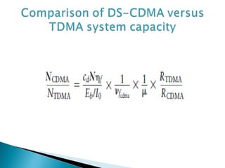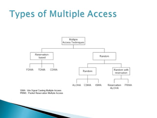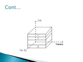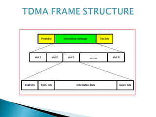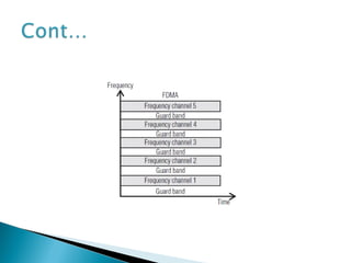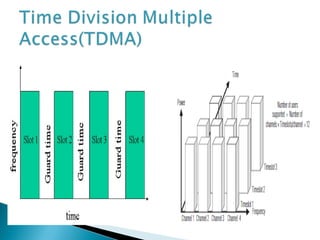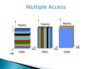 Multiple access techniques allow multiple users to share the same wireless spectrum simultaneously. Common techniques include frequency division multiple access (FDMA), time division multiple access (TDMA), and code division multiple access (CDMA). FDMA assigns each user a different frequency band. TDMA assigns each user time slots on the same frequency. CDMA spreads each user's signal across the entire frequency band using unique codes.