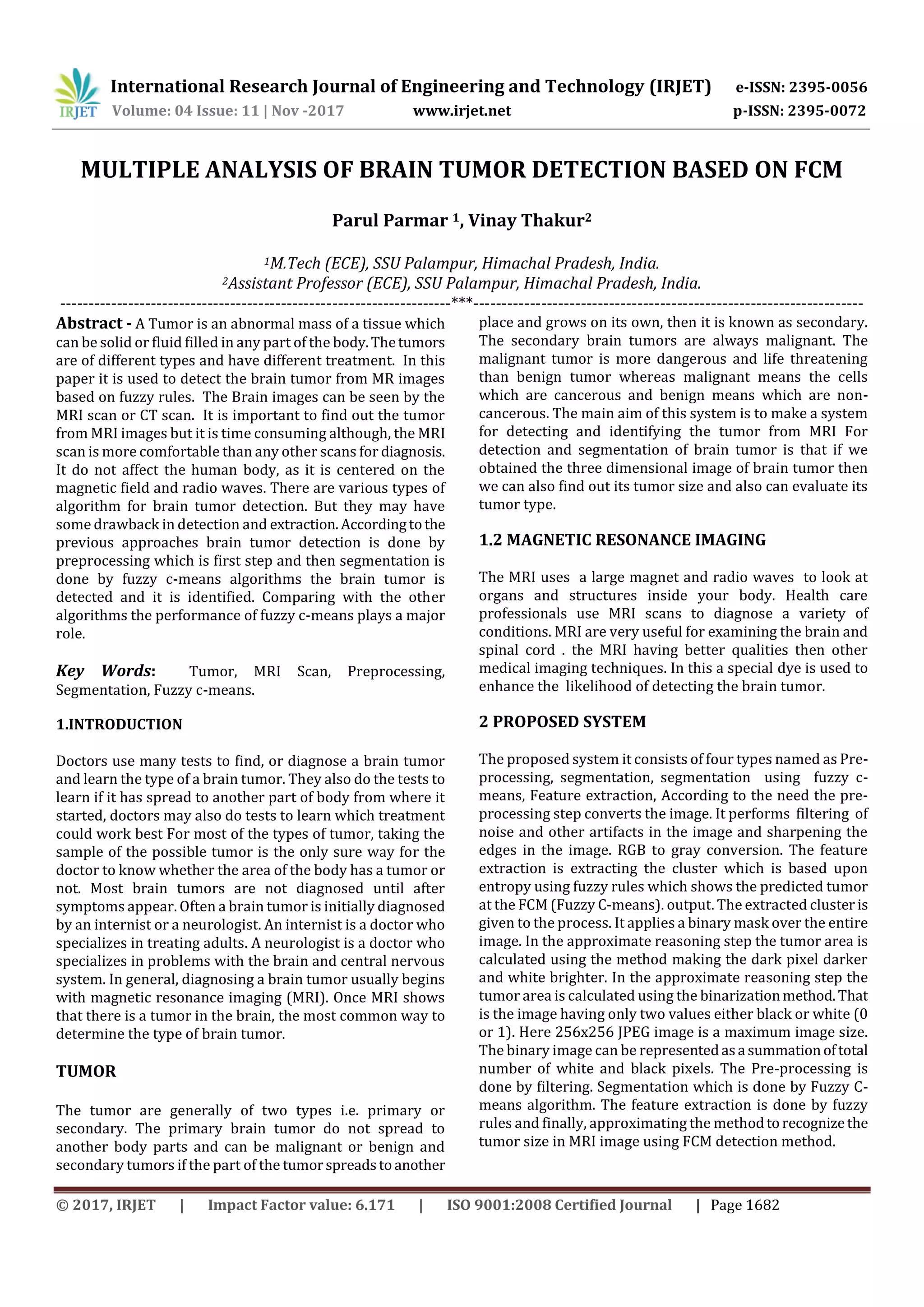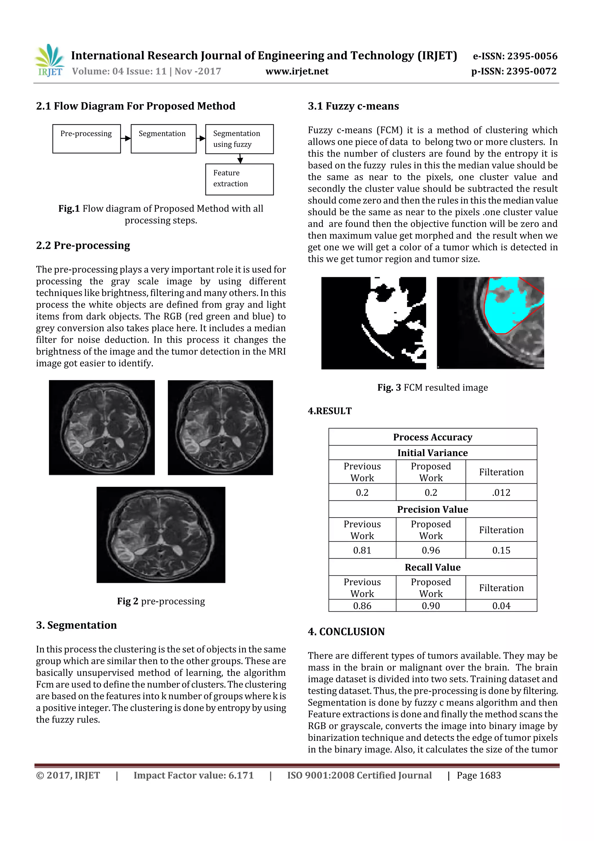 This document summarizes a research paper that proposes a method for detecting brain tumors in MRI images using fuzzy c-means clustering. It begins with an introduction to brain tumors and MRI imaging. It then describes the proposed method which includes pre-processing the MRI images, segmenting the images using fuzzy c-means clustering to identify tumor regions, extracting features using fuzzy rules, and analyzing the results to determine tumor size and location. The method is compared to previous work and shown to improve accuracy, precision, and recall in brain tumor detection. In conclusion, preprocessing helps identification, fuzzy c-means segmentation identifies tumor pixels, and the overall method can detect and analyze brain tumors in MRI images.
