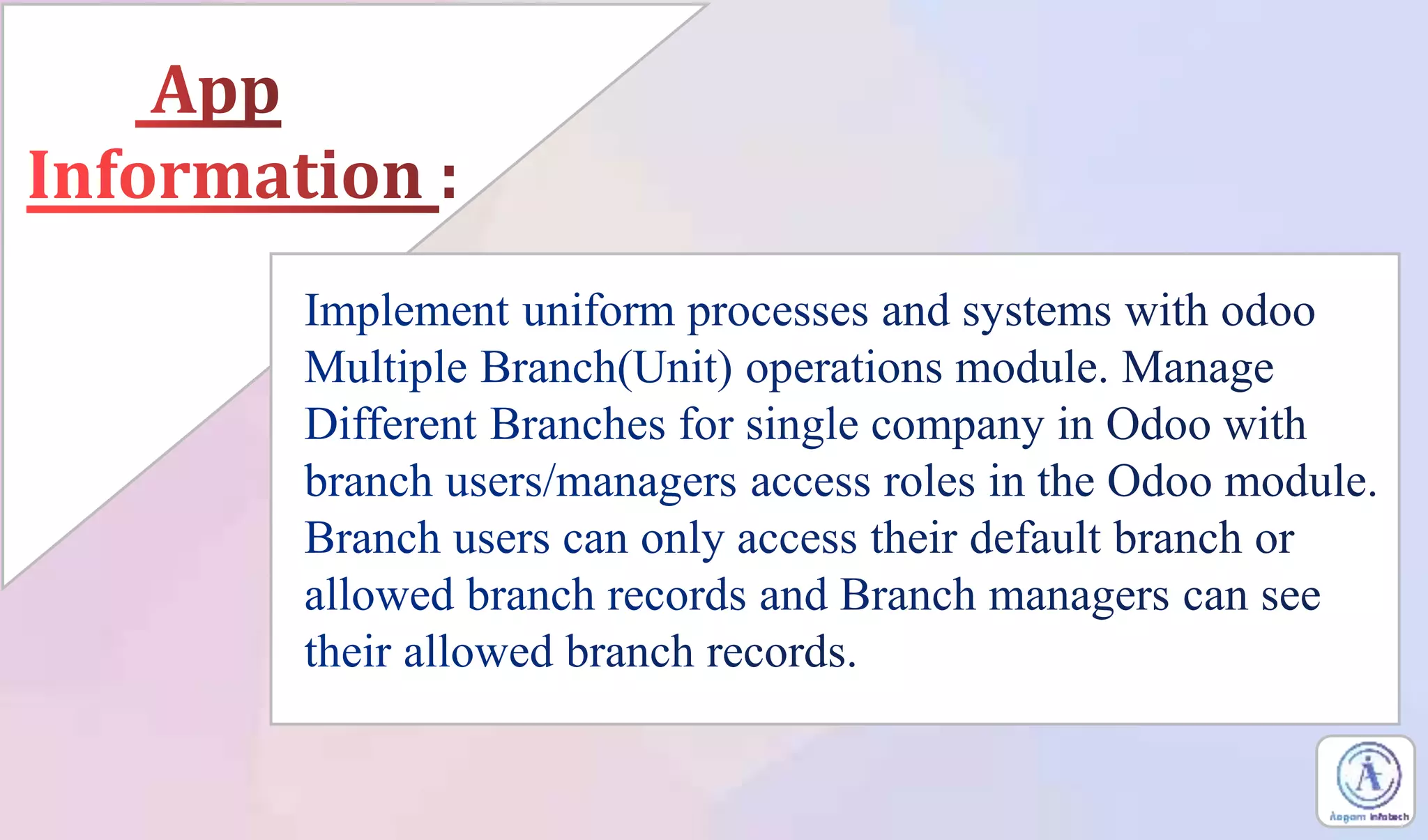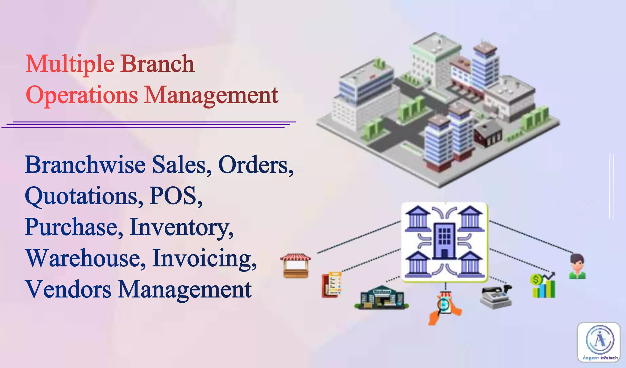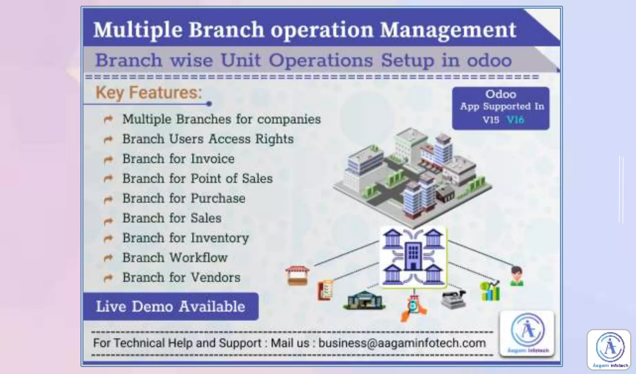 The document outlines a module for managing multiple branches within a company, enabling branch-specific access and streamlined operations. It provides functionality for invoicing, point of sales, purchasing, and inventory management, similar to Odoo's multi-company scenario. This module aims to enhance efficiency and configurability across various business operations.