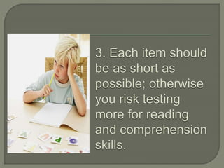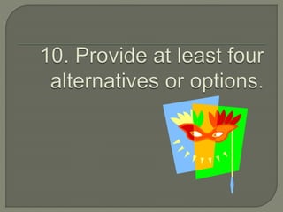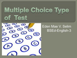 The document discusses different types of multiple choice questions that can be used in assessments. It provides examples of different question styles including direct questions with one right answer, all of the above/none of the above type questions, and questions with distractors that appear plausible but are incorrect. It also mentions some important characteristics for effective multiple choice questions such as versatility, validity, reliability, and efficiency.