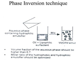 Multiple emulsions are complex systems that contain both water-in-oil (W/O) and oil-in-water (O/W) emulsions. They are thermodynamically unstable and require a combination of hydrophilic and hydrophobic surfactants to stabilize them. Common types include W/O/W and O/W/O emulsions. Multiple emulsions can prolong the release of active ingredients and have applications in controlled drug delivery, targeted delivery, and more. They are prepared using techniques like solvent evaporation or double emulsification and provide a novel carrier system for drugs, cosmetics, and other agents.