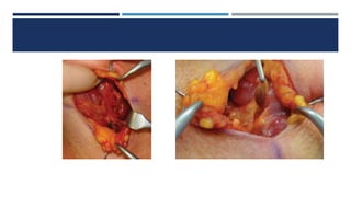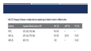 This document discusses multiple endocrine neoplasia type 2 (MEN2), which includes MEN2A, MEN2B, and familial medullary thyroid cancer (FMTC). The key features are medullary thyroid cancer, pheochromocytoma, and parathyroid abnormalities. MEN2 is caused by mutations in the RET proto-oncogene. Treatment involves screening and prophylactic surgery to prevent primary tumors from developing. Lifelong biochemical screening is recommended for affected individuals and their relatives.