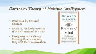 Dr. Howard Gardner developed the theory of multiple intelligences after observing children and brain-damaged adults. He believed that intelligence is not a single general ability but rather consists of eight different types: linguistic, logical-mathematical, spatial, bodily-kinesthetic, musical, interpersonal, intrapersonal, and naturalistic. Each type of intelligence has its own strengths and characteristics. Gardner's theory challenged the traditional view of intelligence as a single general ability.