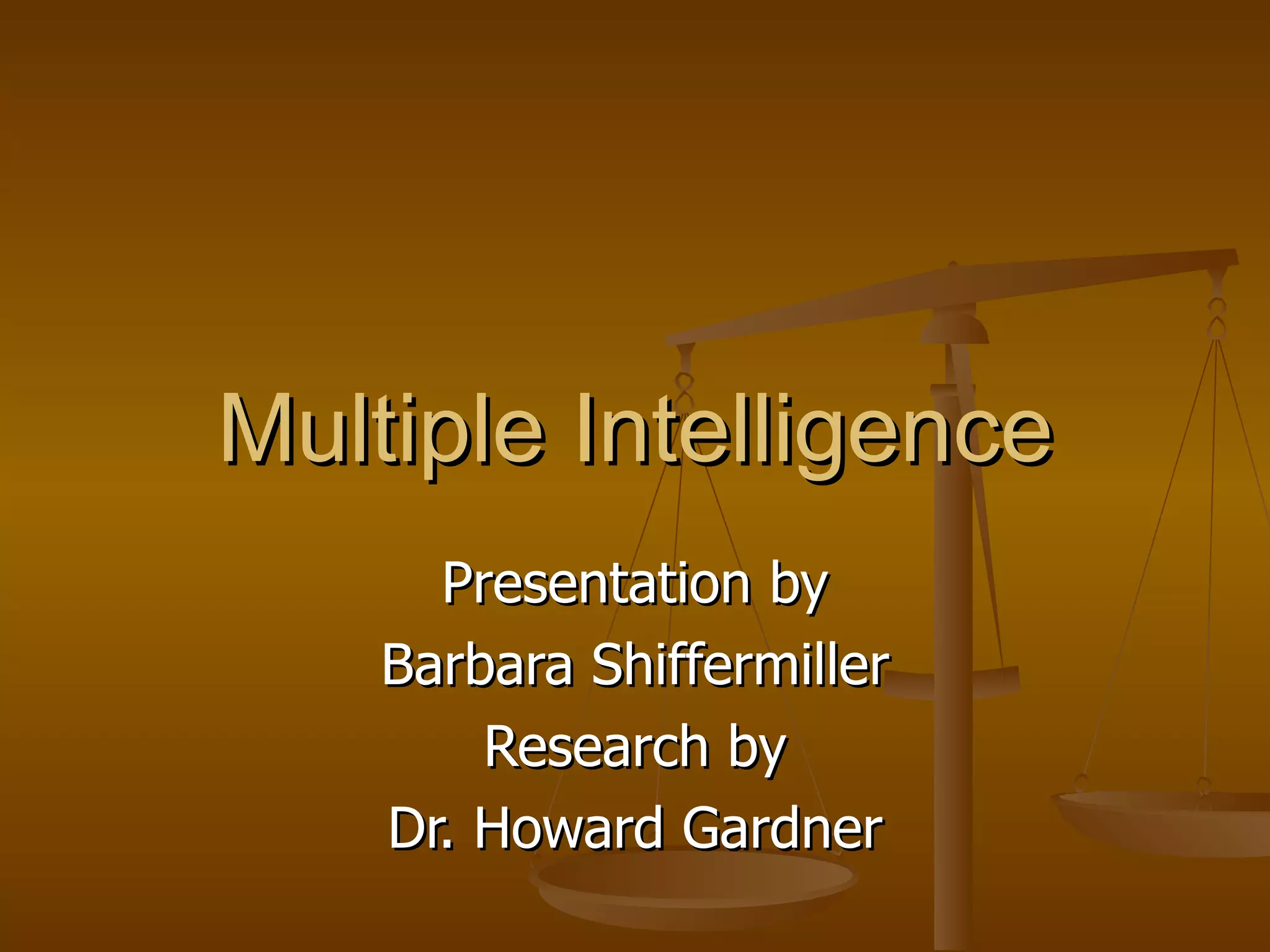The document discusses Howard Gardner's theory of multiple intelligences, which identifies eight different types of intelligence: linguistic, logical-mathematical, spatial, bodily-kinesthetic, musical, interpersonal, intrapersonal, and naturalist. It provides brief descriptions of each type of intelligence, noting their key abilities and examples of careers that rely on each intelligence.