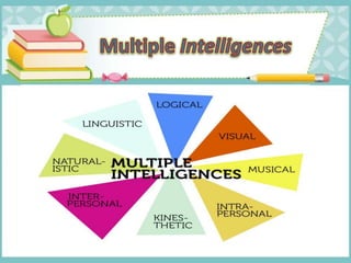 Intelligence is defined as the ability to acquire and use knowledge to solve problems and adapt. There are multiple types of intelligence including linguistic, logical-mathematical, visual-spatial, bodily-kinesthetic, musical, interpersonal, intrapersonal, and naturalist. Howard Gardner's theory of multiple intelligences identifies at least eight intelligences and acknowledges that all people have unique combinations of strengths in these areas. Approaching learning and assessment through multiple intelligences allows more students to successfully participate in the classroom.