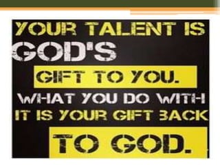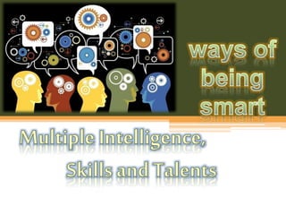 The document discusses pick-up lines and multiple intelligences. It provides examples of verbal-linguistic, math-logic, spatial, bodily-kinesthetic, musical, interpersonal, intrapersonal, and naturalist intelligences. It then discusses skills versus talents, foundational versus functional skills, and the role of a mentor in guiding a mentee to develop their skills and talents, including any undiscovered or hidden talents.