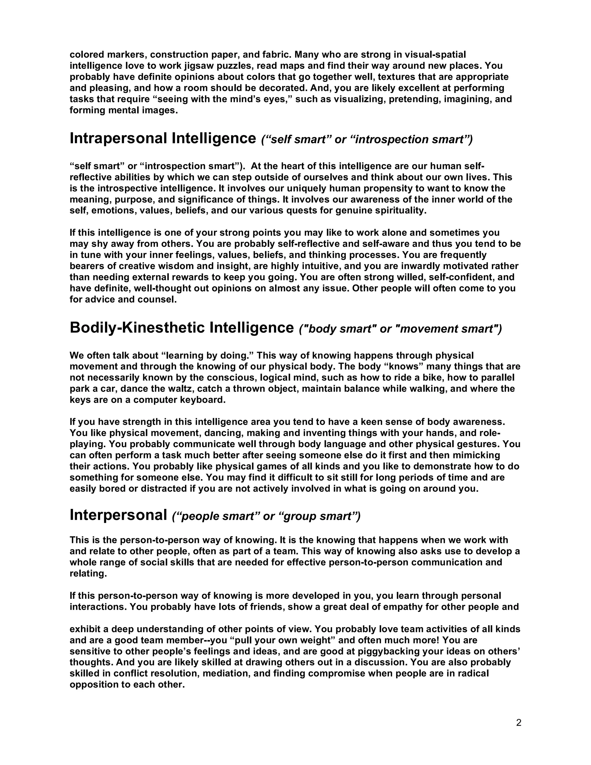 Howard Gardner proposed the theory of multiple intelligences which identifies several relatively autonomous human intellectual competences. The theory identifies eight intelligences: verbal-linguistic, logical-mathematical, visual-spatial, bodily-kinesthetic, musical, interpersonal, intrapersonal, and naturalist. The theory suggests that individuals possess combinations of these intelligences in different strengths, and that individuals with different intellectual profiles may excel in different tasks or professions.