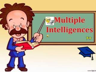 The document discusses Howard Gardner's theory of multiple intelligences, which proposes that intelligence is not a single entity but rather composed of at least eight different dimensions or intelligences. It claims that everyone possesses each of these intelligences to some degree and can develop them throughout life. The eight intelligences identified are linguistic, logical-mathematical, spatial, bodily-kinesthetic, musical, interpersonal, intrapersonal, and naturalist. Examples of each type of intelligence and activities that engage each one are provided. The document also discusses how a teacher's own dominant intelligences can affect their teaching style and the need to support all types of learners.