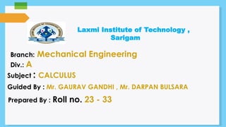 This document contains information about a calculus project completed by students of the Mechanical Engineering department at Laxmi Institute of Technology in Sarigam. It includes the names and student IDs of 13 students who participated in the project. The document covers topics in multiple integrals, including double integrals, Fubini's theorem, double integrals in polar coordinates, and triple integrals. Formulas and examples are provided for each topic.