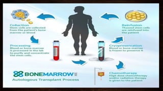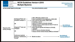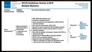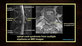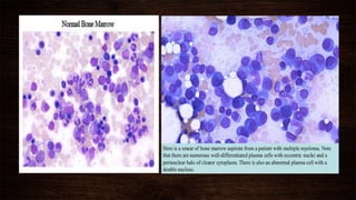 This document discusses multiple myeloma, a plasma cell neoplasm. It covers the epidemiology, etiology, clinical presentation, diagnostic workup, staging, prognostic factors, and treatment approaches for multiple myeloma. Key points include that multiple myeloma accounts for 22% of all mature B-cell neoplasms and presents with hematologic dysfunction, bone disease, infections, and organ impairment. Diagnosis involves blood and bone marrow tests to detect monoclonal proteins and clonal plasma cells. Treatment may include chemotherapy, stem cell transplantation, radiation therapy, immunotherapy, and management of symptoms.