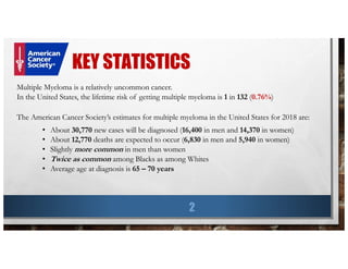 This document provides information about multiple myeloma, including key statistics, risk factors, symptoms, diagnosis, and tests. It summarizes findings from a retrospective analysis of over 1,000 multiple myeloma patients at the Mayo Clinic from 1985 to 1988. The analysis found that the median age at diagnosis was 66 years old, common symptoms at presentation included anemia (73% of patients), bone pain (60% of patients), and renal disease (20% of patients had elevated creatinine). The median survival time was 33 months and did not improve from 1985 to 1988.
