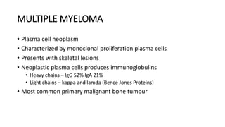 1) Multiple myeloma is a plasma cell neoplasm characterized by monoclonal proliferation of plasma cells that present with skeletal lesions. It most commonly involves the spine, ribs, and pelvis.