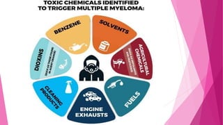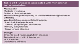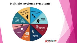 Multiple myeloma is a neoplastic disease characterized by plasma cell accumulation in the bone marrow, the presence of monoclonal protein in the serum and/or urine, and related tissue damage in symptomatic patients. The growth of myeloma cells disrupts normal bone marrow function, reduces immune function, results in abnormal monoclonal protein production released into the blood and urine, and destroys and invades surrounding bone. The initial diagnostic evaluation of multiple myeloma includes examining the peripheral smear for Roulex formation, protein electrophoresis for an M spike, bone marrow aspirate and biopsy, and checking bones for lytic lesions.