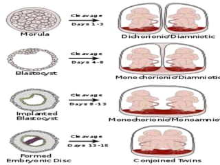 This document discusses multiple pregnancy, specifically twins. It begins by outlining Hellin's Rule which describes the statistical likelihood of having multiples based on maternal factors. It then differentiates between dizygotic and monozygotic twins and describes the key differences. Factors that can increase the chances of dizygotic twins are also outlined. The rest of the document details various maternal and fetal complications that can arise in twin pregnancies such as preeclampsia and preterm birth. Specific complications of monozygotic twins like twin-twin transfusion syndrome are also explained.