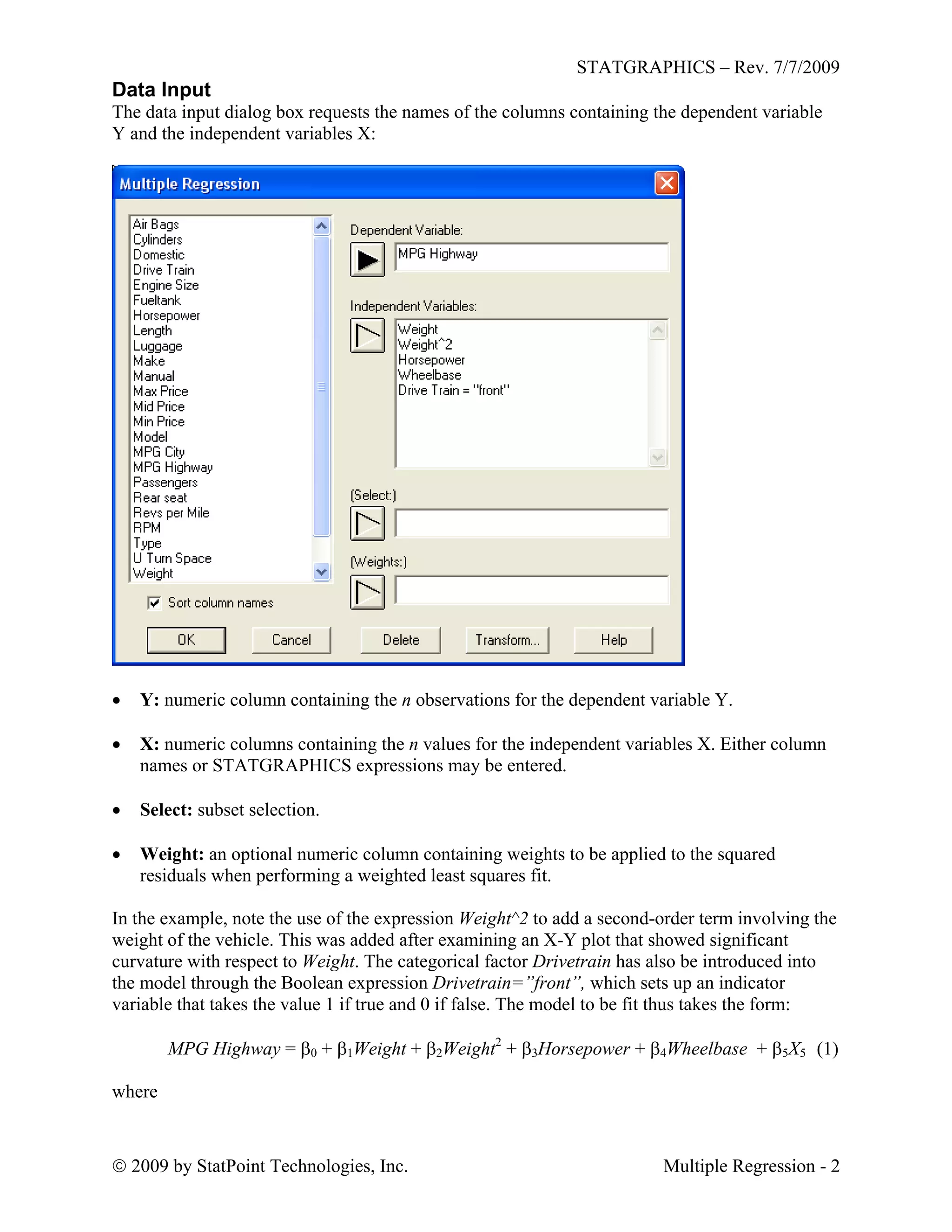 The document explains the multiple regression procedure used to model the relationship between multiple independent variables and a dependent variable, with options for stepwise regression, residual analysis, and data transformations. Using a dataset related to automobiles, it builds a model to predict highway miles per gallon (mpg) based on factors like weight and horsepower, and evaluates the significance of the variables. The document includes detailed analysis statistics, options for model fitting, and transformation techniques to enhance model performance.