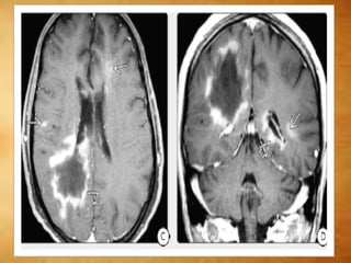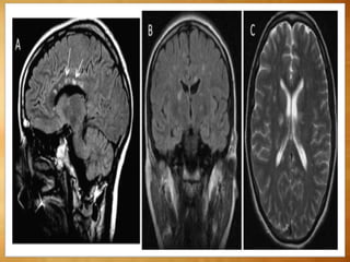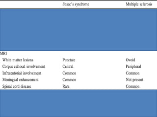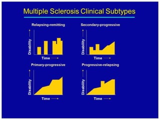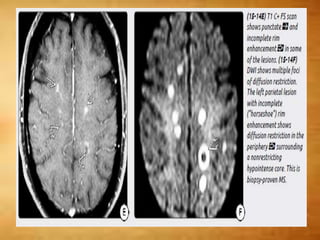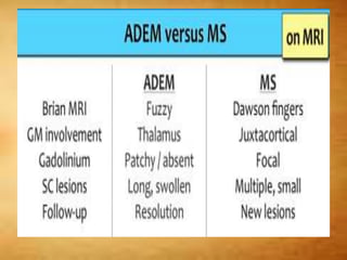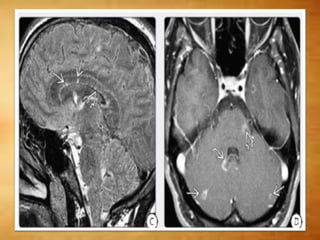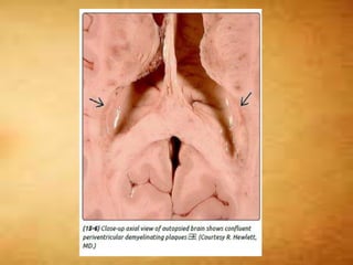 This document summarizes multiple sclerosis (MS), a chronic inflammatory demyelinating disease of the central nervous system. It discusses the etiology, pathology, clinical presentation, imaging features, diagnostic criteria, variants, and differential diagnosis of MS. Key points include: MS is characterized by inflammatory demyelinating lesions ("plaques") in the brain and spinal cord; risk factors include genetic and environmental factors; clinical presentation varies from relapsing-remitting to progressive forms; MRI is important for diagnosis and demonstrates disseminated hyperintense lesions; and differential diagnosis includes ADEM, Susac syndrome, and CNS tumors.