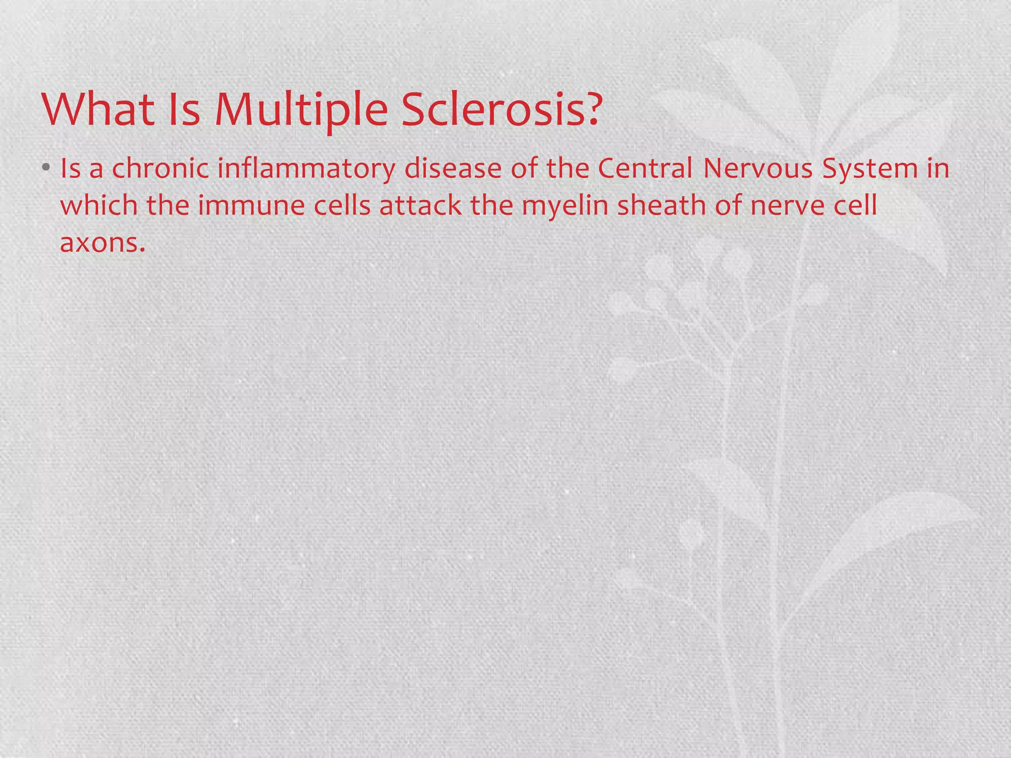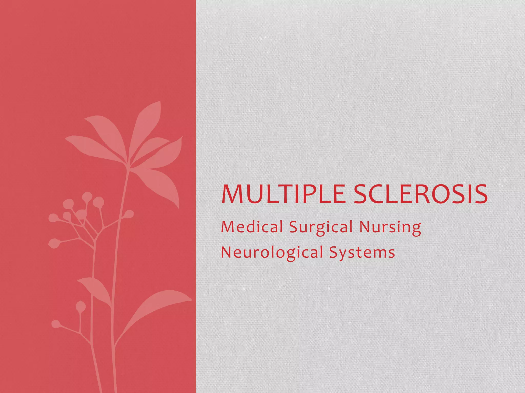 Multiple sclerosis is a chronic disease of the central nervous system where the immune system attacks the myelin sheath protecting nerve cells. Symptoms vary depending on location and severity of attacks and can include issues with muscle control, sensation, vision, speech, swallowing, as well as bowel and bladder function. While there is no cure, treatment aims to manage symptoms and maintain quality of life through medications that slow progression like various interferons, glatiramer acetate, and mitoxantrone.