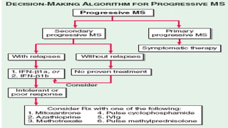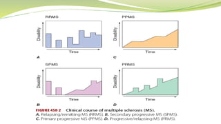 Multiple sclerosis is an autoimmune disease that affects the central nervous system. It is characterized by chronic inflammation, demyelination, and scarring of the brain and spinal cord. Lesions typically develop in different areas of the central nervous system at different times. Approximately 350,000 people in the US and 2.5 million worldwide have MS. The clinical course can vary significantly between individuals. There is no definitive test for diagnosing MS, but criteria require evidence of lesions in different areas of the central nervous system separated in time and space, supported by MRI or other tests.
