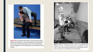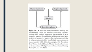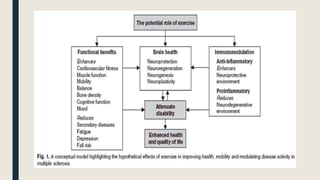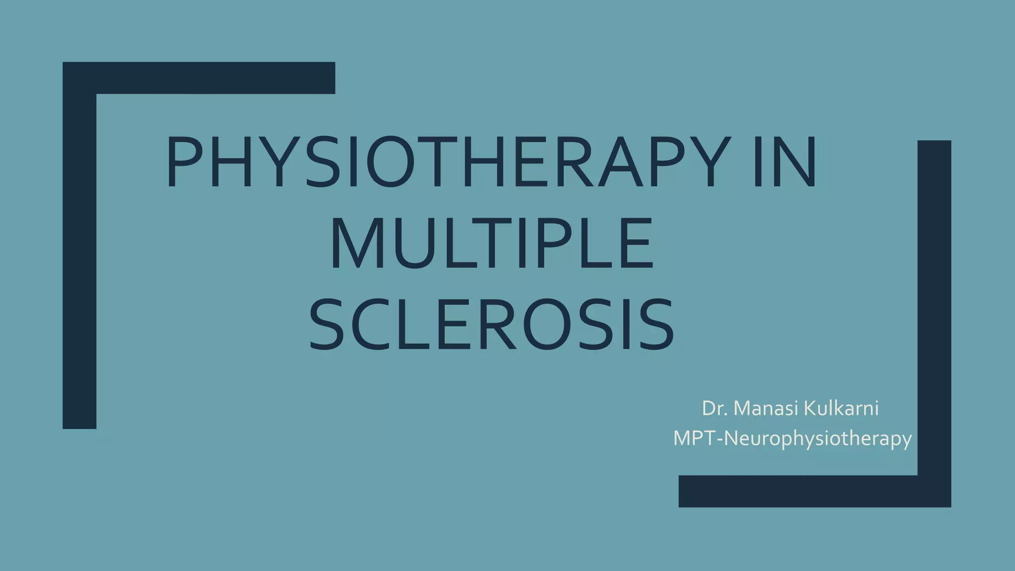 The document discusses physiotherapy for managing multiple sclerosis (MS), detailing its clinical features, physiotherapy roles, and management strategies for various symptoms such as sensory deficits, pain, fatigue, spasticity, balance, and swallowing. It also highlights recent advances in physiotherapy interventions and their effectiveness, particularly regarding spasticity and pain management. The document concludes with references to key literature supporting these approaches.