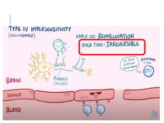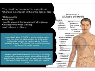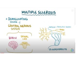 Multiple sclerosis (MS) is an autoimmune disease of the central nervous system characterized by chronic inflammation and demyelination, more prevalent in females aged 20-40. Diagnosis involves identifying symptoms, objective evidence of CNS involvement, and MRI characteristics showing lesions, among other diagnostic tools. Treatment options include acute therapies like intravenous steroids and disease-modifying therapies tailored based on disease activity, with special considerations for pregnancy and COVID-19.