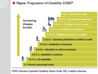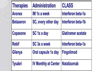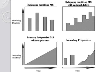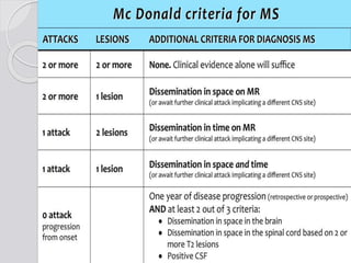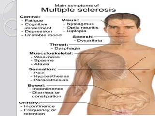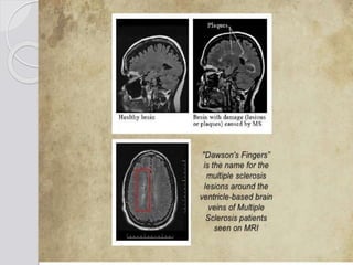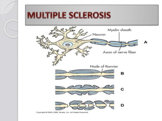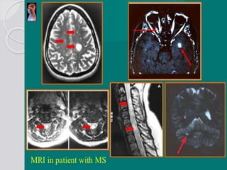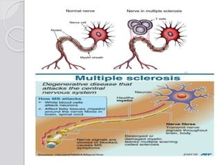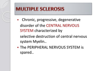 This document discusses multiple sclerosis (MS), a demyelinating disease of the central nervous system. It begins by defining MS and describing its characteristic features, including inflammation, demyelination, and scarring in the brain and spinal cord. It then covers the clinical manifestations of MS, diagnostic testing methods, treatment approaches including disease-modifying drugs, and potential side effects of treatments.