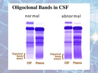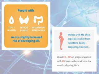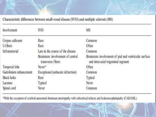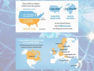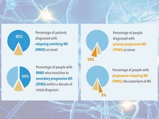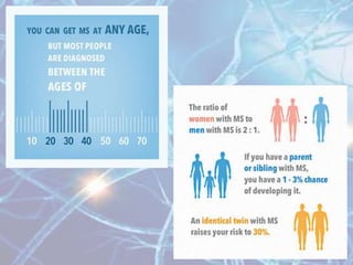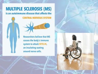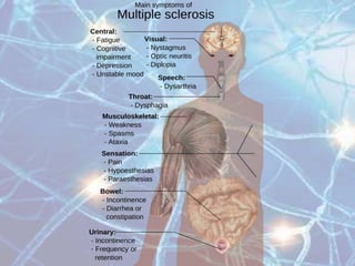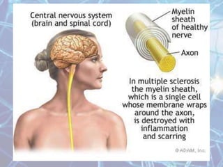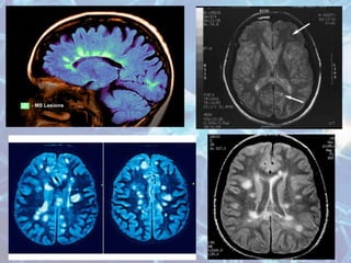Multiple sclerosis is an autoimmune disease of the central nervous system characterized by demyelination of nerve fibers. It most commonly presents in young adults between 20-40 years of age and is more prevalent in women. Symptoms vary depending on the location of lesions but commonly include weakness, numbness, vision issues, and balance problems. Diagnosis involves MRI of the brain showing characteristic white matter lesions. Treatment focuses on reducing relapses through disease-modifying drugs for relapsing-remitting MS, and managing symptoms like spasticity, pain, and bladder problems.