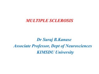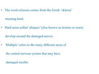 - There are several types of MS defined by patterns of relapse and progression of symptoms. Management involves medications to reduce inflammation and manage relapses as well as physiotherapy focusing on exercises, balance training, managing fatigue, and compensatory strategies to improve function and quality of life.