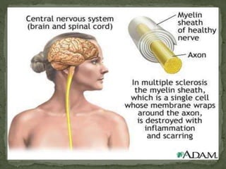 This document provides an overview of demyelinating diseases of the central nervous system, with a focus on multiple sclerosis. It discusses the etiology, pathogenesis, clinical features, diagnosis, treatment and management of multiple sclerosis. Key points include: MS results from an autoimmune attack on the myelin sheath surrounding nerves in the brain and spinal cord; diagnosis involves evidence of lesions disseminated in space and time via MRI or other tests; and treatments include steroids for acute attacks and disease-modifying drugs such as interferons to reduce relapse rates long-term.
