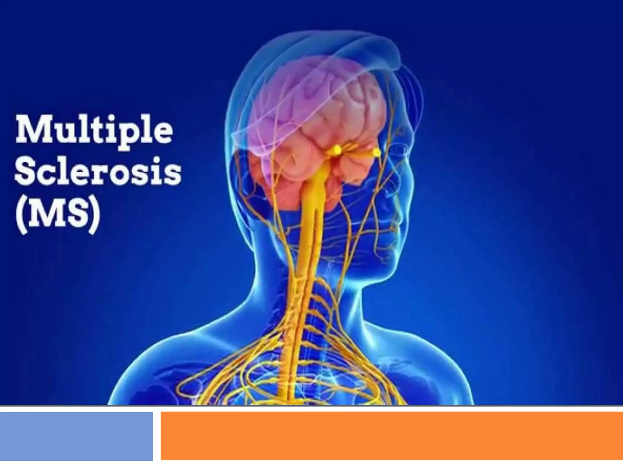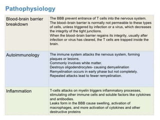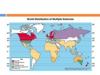 Multiple sclerosis (MS) is a neurodegenerative disease that affects the central nervous system through inflammation and demyelination. It is more common in women than men and typically occurs in young adults between 20-40 years old. MS is predominantly found in northern regions of the world. While its cause is unknown, genetic and environmental factors like infections are thought to play a role. Symptoms vary depending on the areas of the nervous system affected but can include vision problems, impaired movement, sensory issues, and mental changes. The disease progresses over time and treatment aims to manage symptoms and reduce inflammation.