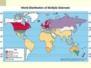 Multiple sclerosis is an inflammatory demyelinating disorder of the central nervous system that is more common in northern latitudes and among Caucasian populations. It typically presents with sensory disturbances, weakness, and visual problems and is diagnosed based on disseminated lesions found on MRI. Management involves immunosuppression and physical/occupational therapy to address symptoms and maintain function. Prognosis depends on factors like age of onset, relapse rate, and the degree of disability.