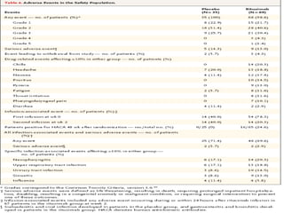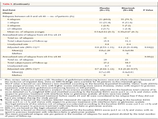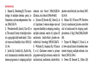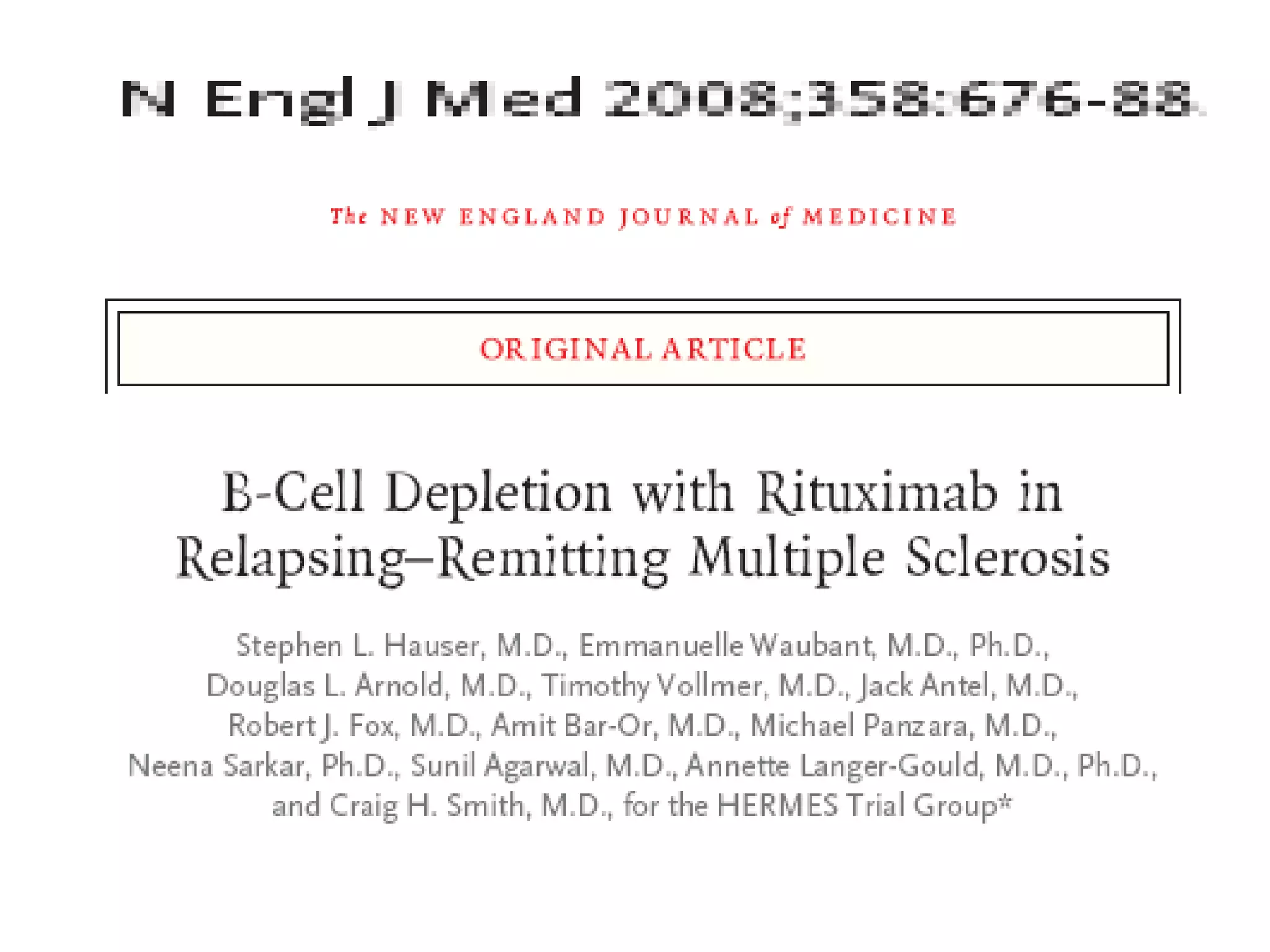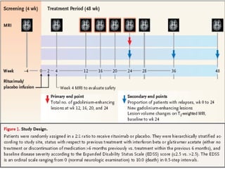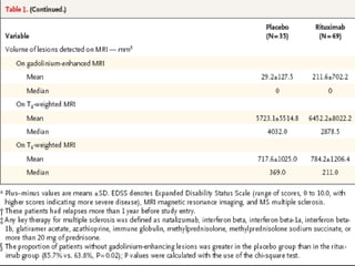 This randomized, double-blind, placebo-controlled study evaluated the efficacy and safety of rituximab for relapsing-remitting multiple sclerosis. 104 patients were randomized to receive either rituximab or placebo intravenous infusions. The primary outcome was the number of gadolinium-enhancing lesions on MRI scans from weeks 12-24. Patients receiving rituximab had significantly fewer lesions compared to placebo, indicating rituximab reduces disease activity in multiple sclerosis. Rituximab also decreased relapse rates and reduced lesion volumes on MRI. The most common adverse events were mild to moderate infusion reactions. This study provides evidence that B cell depletion with rituximab is effective and relatively safe for rel