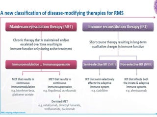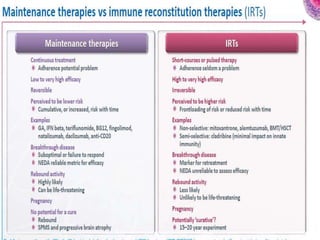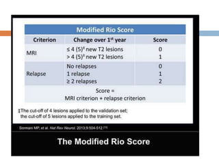 This document provides guidelines for the diagnosis and treatment of multiple sclerosis (MS). It discusses the different subtypes of MS, diagnostic criteria, disease mechanisms, epidemiology in India, clinical features of relapses, and guidelines for using disease-modifying therapies. Key recommendations include using McDonald criteria for diagnosis, treating relapsing forms of MS with approved disease-modifying drugs, monitoring patients on treatment, and considering ocrelizumab for primary progressive MS.