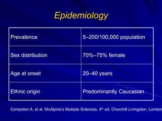 This document provides information on multiple sclerosis (MS), including its epidemiology, pathogenesis, clinical presentations, diagnosis, and treatment options. It summarizes that MS is the most common autoimmune demyelinating disease of the central nervous system characterized by inflammation and demyelination in the brain and spinal cord. Current first-line treatments for relapsing-remitting MS include interferon beta, glatiramer acetate, fingolimod, fumarate, teriflunomide, natalizumab, mitoxantrone, and alemtuzumab, which aim to reduce relapse rates and progression of disability.