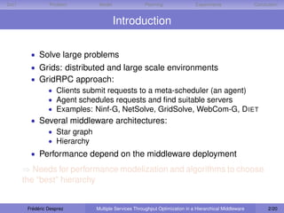 The document discusses optimizing throughput in hierarchical middleware like DIET. It presents DIET and describes its hierarchical architecture. The goal is to determine the optimal deployment of agents and servers across platforms to maximize throughput. It develops models for estimating service times at different levels. It then describes approaches for automatic deployment, including using mixed integer programming or genetic algorithms to evolve populations of solutions.