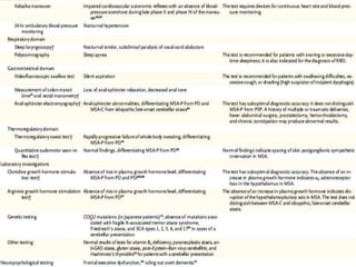Multiple system atrophy is a rare, fatal neurodegenerative disease characterized by parkinsonian or cerebellar features and autonomic dysfunction. It is caused by the accumulation of alpha-synuclein protein in oligodendrocytes throughout the brain and spinal cord. There are no disease-modifying treatments available, so management focuses on alleviating motor symptoms and addressing problems related to autonomic failure and other non-motor issues.