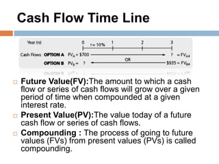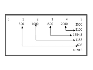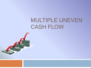 This document discusses calculating the present value and future value of multiple uneven cash flows. It provides the formulas for present value (PV) and future value (FV) of uneven cash flows. As an example, it calculates the PV of a cash flow of Rs. 1000, Rs. 1500, Rs. 800 and Rs. 400 over 4 years with an interest rate of 8%. It also provides an example to calculate the FV of deposits of Rs. 500, Rs. 1000, Rs. 1500, Rs. 2000, Rs. 2500 over 5 years with an interest rate of 5%.