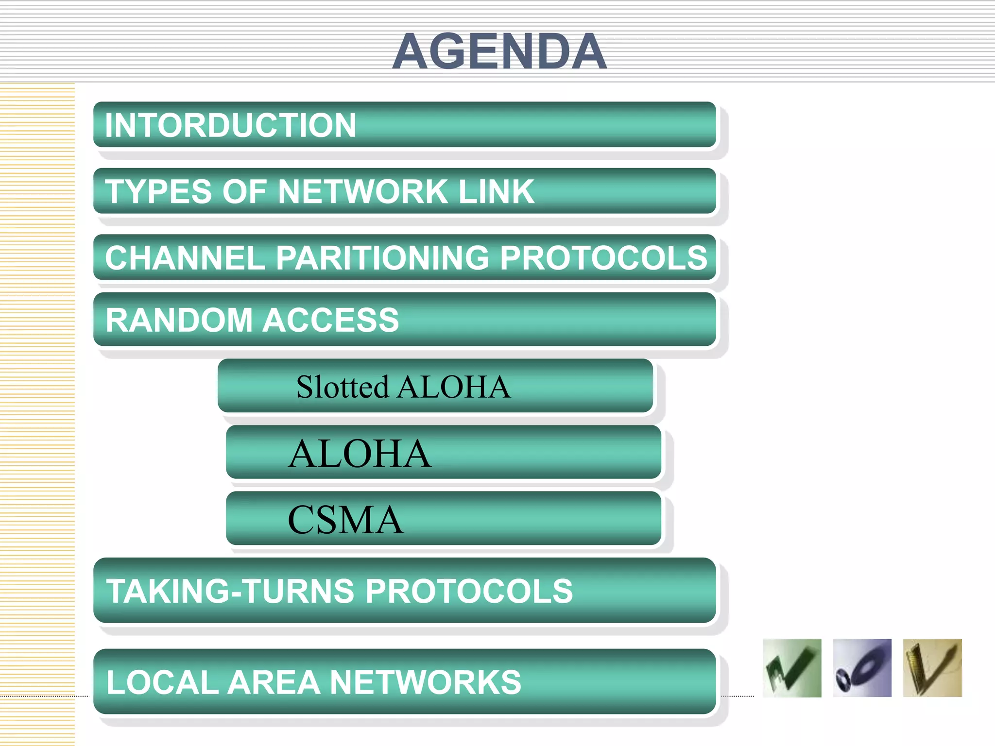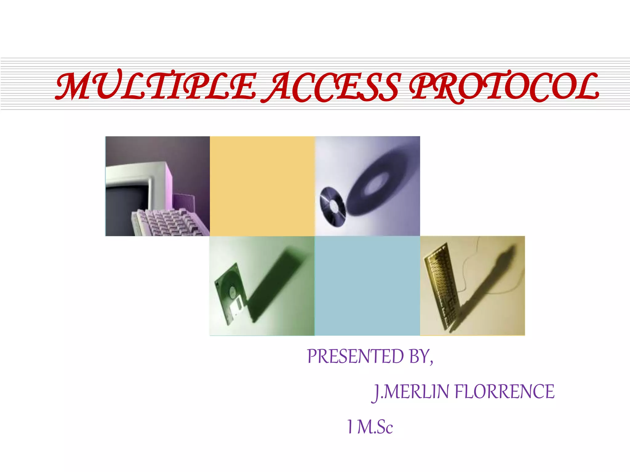 The document discusses multiple access protocols used to coordinate access to shared broadcast channels in wireless and wired local area networks. It describes various channel partitioning, random access, and taking-turns protocols including ALOHA, CSMA, TDMA, FDMA, and token passing. Specifically, it provides details on the operation of slotted ALOHA, CSMA, and CSMA/CD protocols, comparing their efficiencies and ability to handle collisions. It also briefly discusses token ring and FDDI local area network technologies.