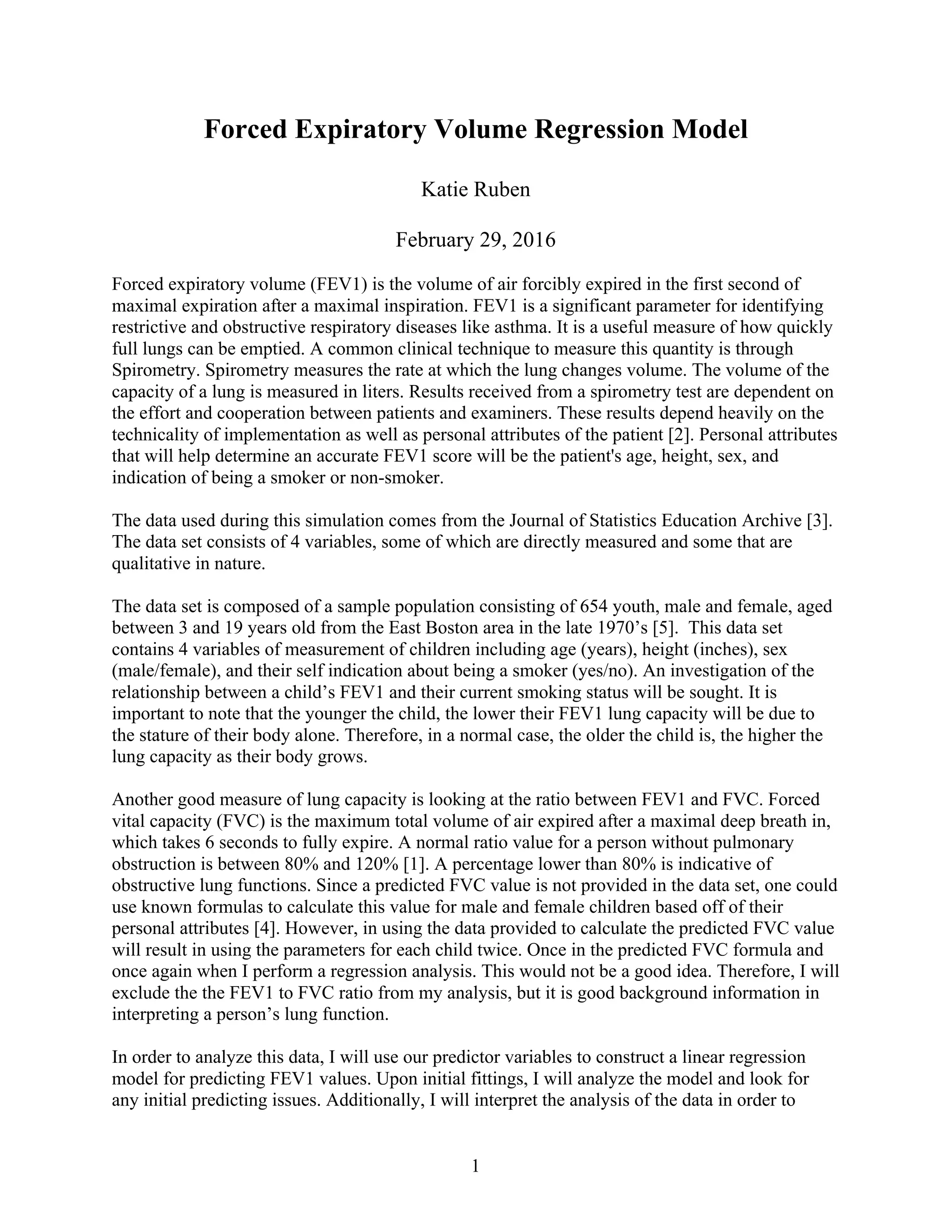 1) The document describes analyzing a dataset containing measurements from 654 youth to build a regression model for predicting forced expiratory volume (FEV1) based on age, height, sex, and smoking status.
