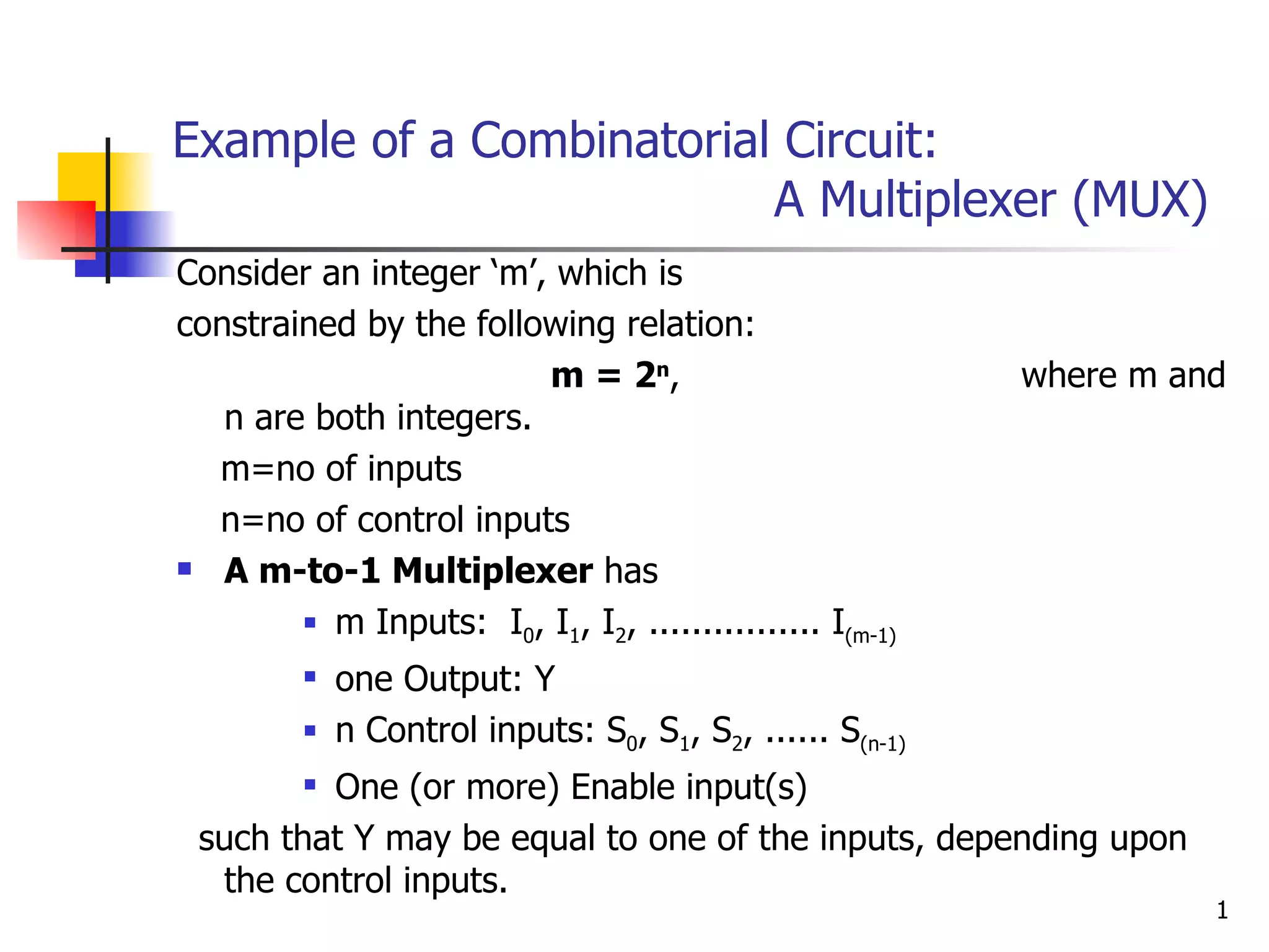 1) A multiplexer is a combinational circuit with m inputs, n control inputs, and 1 output that can select one of the m inputs to pass to the output based on the values of the n control inputs.